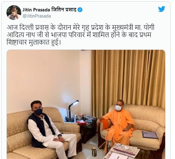गुरुवार को दिल्ली में मंथन के लिए पहुंचे सीएम योगी आदित्यनाथ से जितिन प्रसाद ने मुलाकात की थी। सीएम योगी से मुलाकात के बाद जितिन प्रसाद ने ट्वीट किया, ‘आज दिल्ली प्रवास के दौरान मेरे गृह प्रदेश के मुख्यमंत्री मा. योगी आदित्य नाथ जी से भाजपा परिवार में शामिल होने के बाद प्रथम शिष्टाचार मुलाकात हुई।’