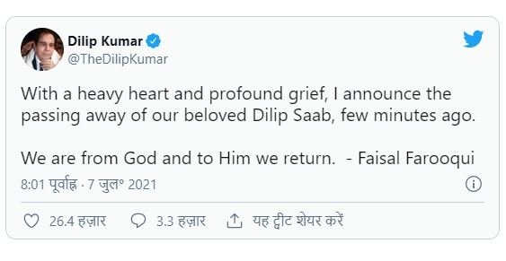 दिलीप कुमार के ऑफिशल ट्विटर हैंडल पर उनके निधन की जानकारी दी गई है। फिल्म इंडस्ट्री के लोग और उनके फैंस सोशल मीडिया पर श्रद्धांजलि दे रहे हैं। मीडिया रिपोर्ट्स के मुताबिक, उनका इलाज कर रहे पल्मोनॉजिस्ट डॉक्टर जलील पार्कर उनके निधन की जानकारी दी।