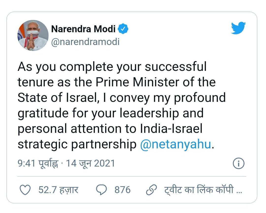 प्रधानमंत्री मोदी ने सफल कार्यकाल की समाप्ति पर पूर्व प्रधानमंत्री नेतन्याहू की सराहना की और भारत-इजराइल रणनीतिक साझेदारी पर निजी तौर पर ध्यान देने के लिए उनके नेतृत्व के प्रति आभार जताया।