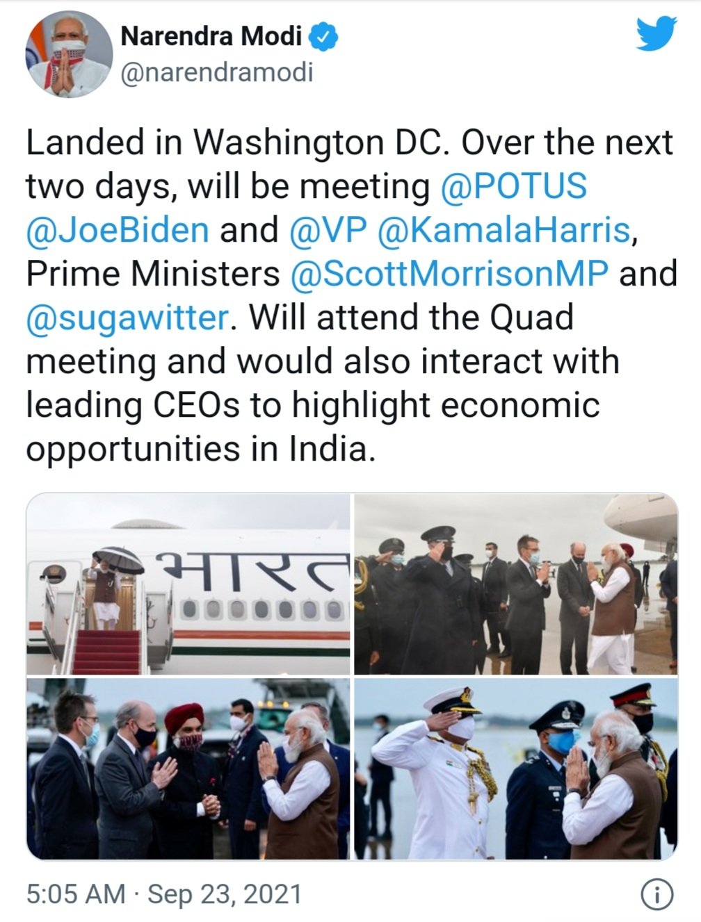 अमेरिका पहुंचने के बाद पीएम मोदी ने भी ट्वीट कर अपने पहुंचने की जानकारी दी। उन्होंने लिखा, ‘वॉशिंगटन डीसी पहुंच गया। अगले दो दिनों में मैं अमेरिकी राष्ट्रपति जो बाइडेन और उपराष्ट्रपति कमला हैरिस, स्कॉट मॉरिसन, योशिहिदे सुगा से मिलूंगा। इस दौरान मैं क्वाड मीटिंग में हिस्सा लूंगा और शीर्ष कंपनियों के सीईओ से मुलाकात कर भारत में आर्थिक उपलब्धियों को उनके सामने रखूंगा।’