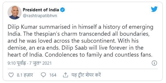 राष्ट्रपति रामनाथ कोविन्द ने कहा, ‘दिलीप कुमार ने अपने आप में उभरते भारत के इतिहास को संक्षेप में प्रस्तुत किया। अभिनेता के आकर्षण ने सभी सीमाओं को पार कर दिया और उन्हें पूरा उपमहाद्वीप प्यार करता था। उनके निधन से एक युग का अंत हो गया है। दिलीप साहब भारत के दिल में हमेशा जिंदा रहेंगे। परिवार और उनके अनगिनत प्रशंसकों के प्रति संवेदना।