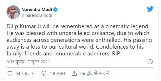 प्रधानमंत्री मोदी ने कहा, ‘ दिलीप कुमार जी को एक सिनेमाई लीजेंड के रूप में याद किया जाएगा। उन्हें अद्वितीय प्रतिभा का आशीर्वाद प्राप्त था, जिसके कारण पीढ़ियों तक दर्शक मंत्रमुग्ध थे। उनका जाना हमारी सांस्कृतिक दुनिया के लिए एक क्षति है। उनके परिवार, दोस्तों और असंख्य प्रशंसकों के प्रति संवेदना।’