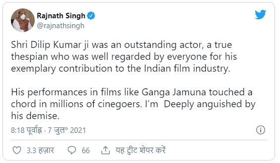 रक्षा मंत्री राजनाथ सिंह ने ट्वीट करके कहा, ‘श्री दिलीप कुमार जी एक उत्कृष्ट अभिनेता थे, जिन्हें भारतीय फिल्म जगत में उनके अनुकरणीय योगदान के लिए सभी ने खूब सराहा। गंगा जमुना जैसी फिल्मों में उनके अभिनय ने लाखों सिनेप्रेमियों को प्रभावित किया। उनके निधन से मुझे गहरा दुख हुआ है। उनके परिवार, दोस्तों और प्रशंसकों के प्रति मेरी हार्दिक संवेदना।’