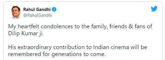 राहुल गांधी ने ट्वीट करके कहा, ‘दिलीप कुमार जी के परिवार, दोस्तों और प्रशंसकों के प्रति मेरी हार्दिक संवेदना। भारतीय सिनेमा में उनके असाधारण योगदान को आने वाली पीढ़ियों तक याद रखा जाएगा।’