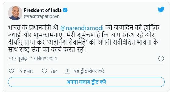 राष्ट्रपति ने अपने ट्वीट में लिखा, ‘भारत के प्रधानमंत्री नरेंद्र मोदी को जन्मदिन की हार्दिक बधाई और शुभकामनाएं। मेरी शुभेच्छा है कि आप स्वस्थ रहें और दीर्घायु प्राप्त कर ‘अहर्निशं सेवामहे’ की अपनी सर्वविदित भावना के साथ राष्ट्र सेवा का कार्य करते रहें।’