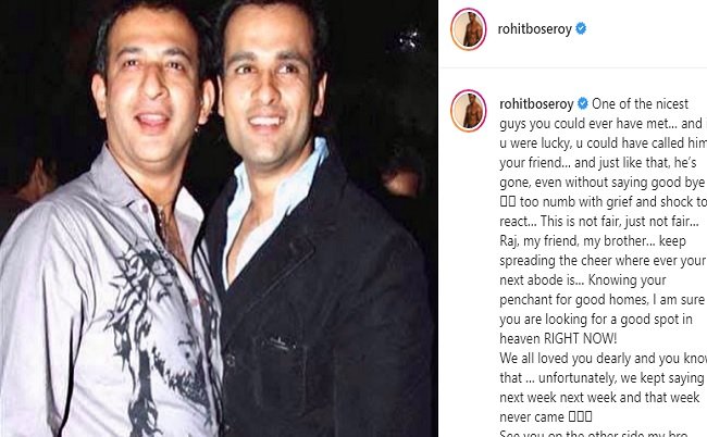 अभिनेता रोहित बोस भी इस खबर के सामने आने के बाद से सदमे में हैं। उन्होंने राज कौशल के साथ अपनी एक तस्वीर इंस्टाग्राम पर शेयर करते हुए लिखा-‘राज, मेरे दोस्त, मेरे भाई। जहां भी आप हैं, वहां खुशियां फैलाते रहें। अच्छे घरों के लिए आपकी रुचि को जानकर, मुझे यकीन है कि आप अभी स्वर्ग में एक अच्छे स्थान की तलाश कर रहे होंगे। हम सब आपको बहुत प्यार करते हैं और आप जानते हैं कि दुर्भाग्य से मिलने के लिए हम कहते रहे कि अगले हफ्ते अगले हफ्ते मिलेंगे।