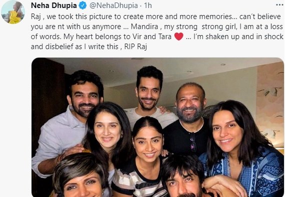 नेहा धूपिया ने भी राज कौशल के साथ खींची गई एक तस्वीर को सोशल मीडिया पर साझा करते हुए लिखा -‘ राज हमने यह तस्वीर अधिक से अधिक यादें बनाने के लिए ली थी, लेकिन विश्वास नहीं कर सकती कि आप अब हमारे साथ नहीं हैं। मेरी मंदिरा मजबूत औरत है। मेरे पास शब्दों की कमी है। मेरा दिल वीर और तारा का हैै। मैं यह लिखते हुए सदमे में हूं और इस अविश्वसनीय खबर से हिल गई हूँ ।’