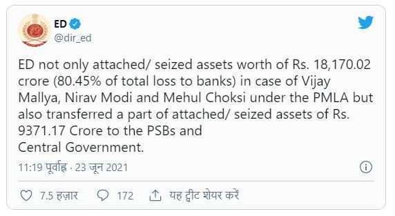 प्रवर्तन निदेशालय ने ट्वीट कर कहा कि ईडी ने न केवल पीएमएलए के तहत विजय माल्या, नीरव मोदी और मेहुल चोकसी के मामले में 18,170.02 करोड़ (बैंकों को कुल नुकसान का 80.45%) रुपये की संपत्ति को जब्त किया है, बल्कि 9371.17 करोड़ की कीमत वाली संपत्ति को सरकारी बैंकों को ट्रांसफर भी किया है।