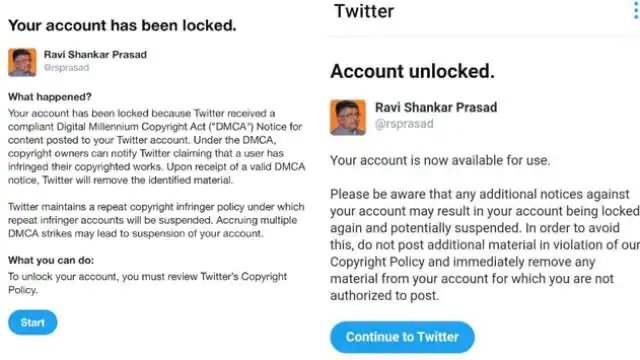 रविशंकर प्रसाद ने कहा कि ह बीते करीब एक घंटे से अपने अकाउंट पर एक्सेस नहीं कर पा रहे थे। कोशिश करने पर बताया गया कि उनके अकाउंट से अमेरिका के डिजिटल मिलेनियम कॉपीराइट ऐक्ट का उल्लंघन हुआ है। हालांकि एक घंटे के बाद अकाउंट को फिर से अनब्लॉक कर दिया गया।
